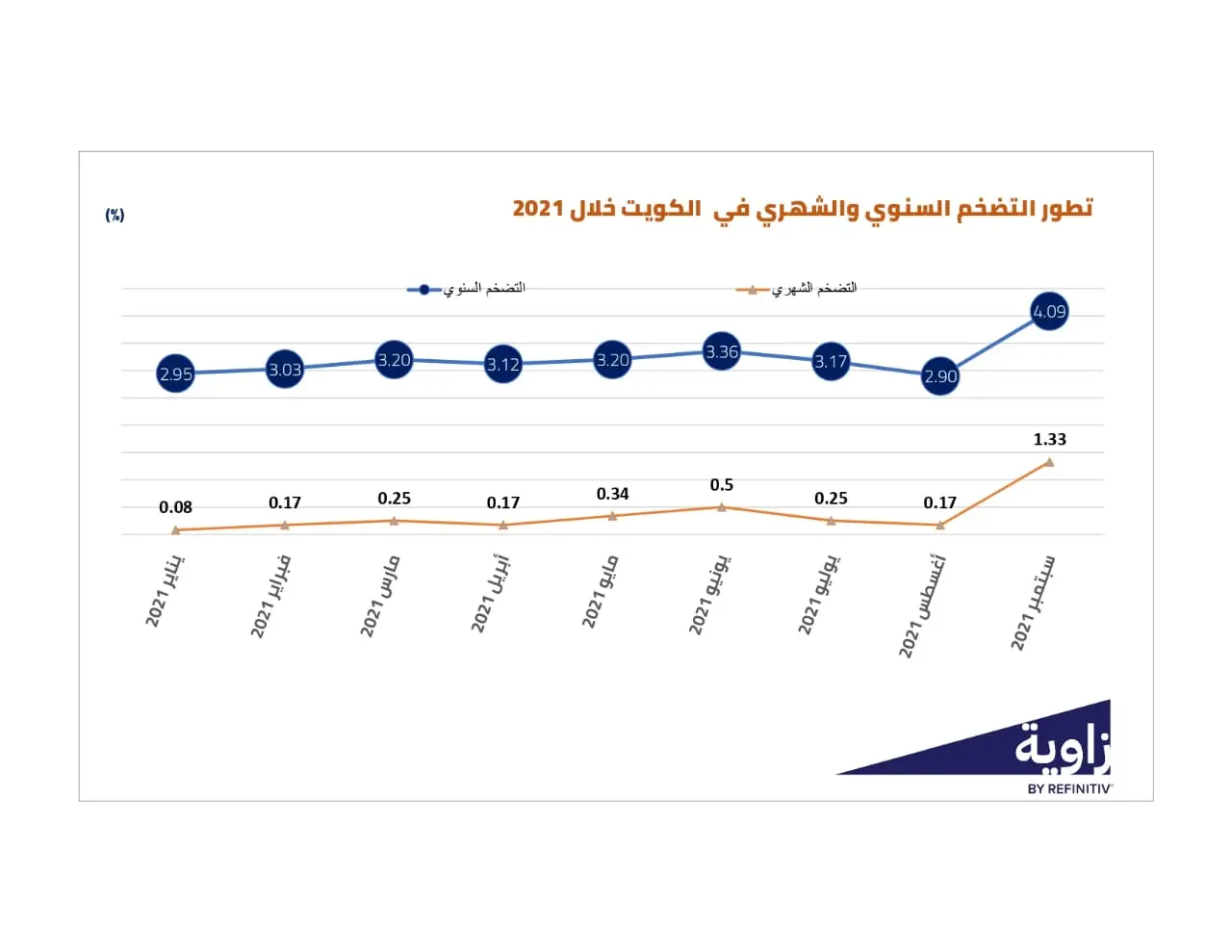 قفز مؤشر أسعار المستهلكين (التضخم) في الكويت إلى 4.09% في سبتمبر الماضي على أساس سنوي، مقابل 2.9% في أغسطس، بحسب بيان من الإدارة المركزية للإحصاء.