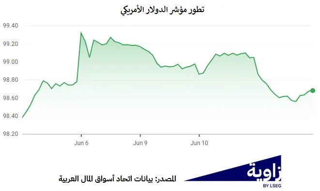 وقد استمر هذا التعافي على صعيد مؤشر الدولار الأمريكي خلال الأسبوع الثاني من الشهر والمنتهي في 13 يونيو وتحديداً بين 9 و10 يونيو، قبل أن يسجل تراجع هام خلال تعاملات الأربعاء 11 يونيو، في ظل بيانات التضخم الأمريكية التي جاءت دون توقعات الأسواق.