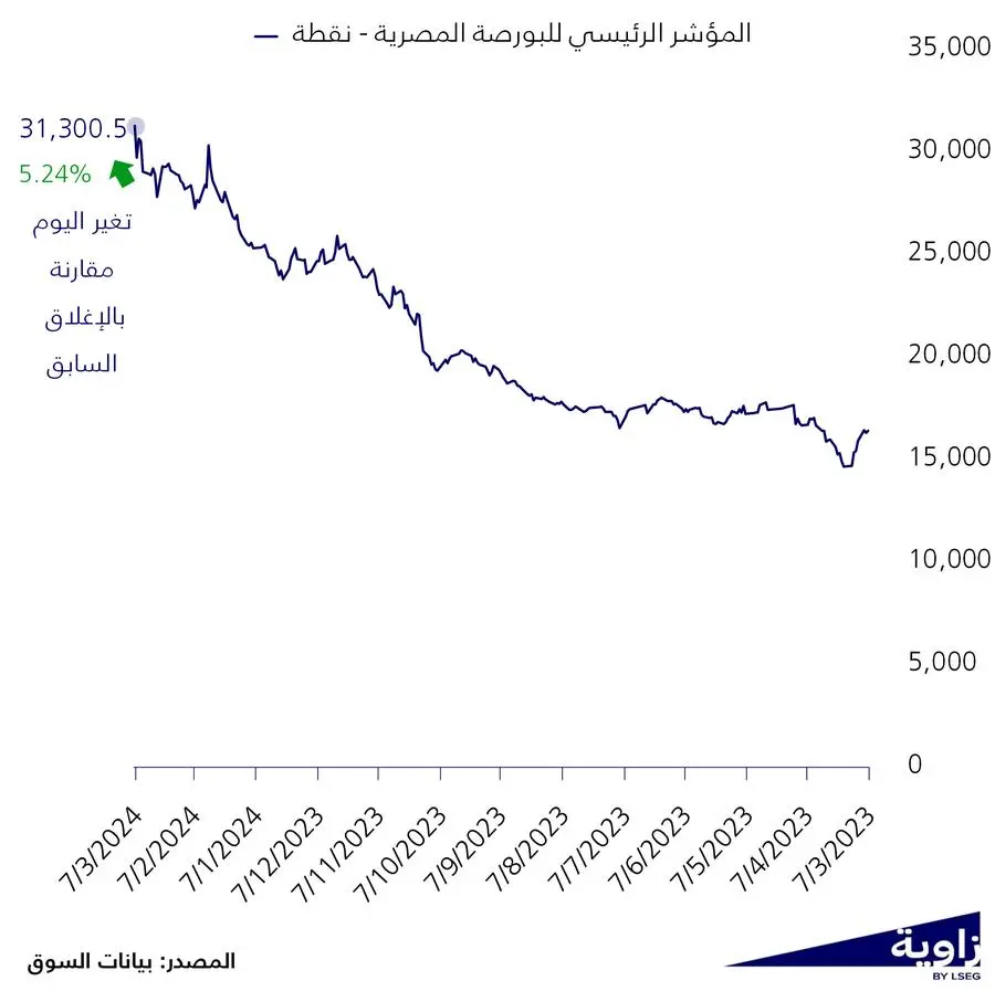 وصعد المؤشر الرئيسي بنهاية تعاملات الخميس بنسبة 5.24% على أساس يومي، وهذه هي أكبر نسبة ارتفاع يومي للمؤشر منذ أبريل 2023.