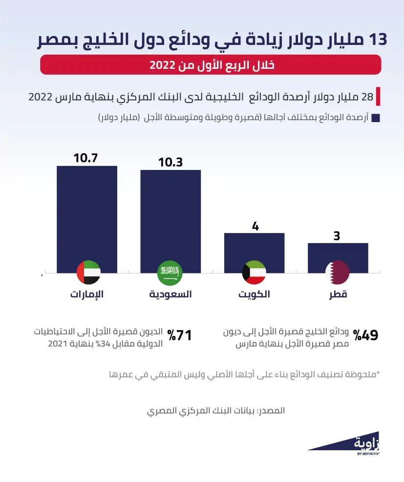 حصلت مصر على 13 مليار دولار ودائع قصيرة الأجل من دول الخليج خلال الربع الأول من العام الحالي بخلاف ما لديها من أرصدة الودائع متوسطة وطويلة الأجل والبالغة حوالي 15 مليار دولار، ليصل بذلك إجمالي أرصدة الودائع الخليجية في مصر (قصيرة ومتوسطة وطويلة الأجل) إلى نحو 28 مليار دولار.