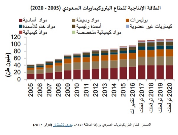 تعد صناعة البتروكيماويات عنصرًا حيويًا للاقتصاد السعودي غير النفطي، حيث بلغت صادرات المملكة من البتروكيماويات والبلاستيك بالقيمة الإسمية عام 2015 نحو 30 مليار دولار (115 مليار ريال)، كما أنها شكلت نسبة كبيرة من إجمالي الصادرات غير النفطية حيث وصلت إلى 60%، وفقًا لتقرير جدوى للاستثمار حول قطاع البتروكيماويات السعودي ورؤية 2030، كما يوضح الشكل التالي: