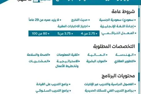 وأوضح عبد الرحمن تركستاني بإن المتقدِّم للالتحاق بالبرنامج يجب أن يكون ملماً باللغة الإنجليزية وحاصل على معدل تراكمي وفق الآتي 2.75 من 3 أو 3.75 من 5، أو 80 من 100؛ على أن يجتاز الاختبارات المقررة من قبل الشركة.