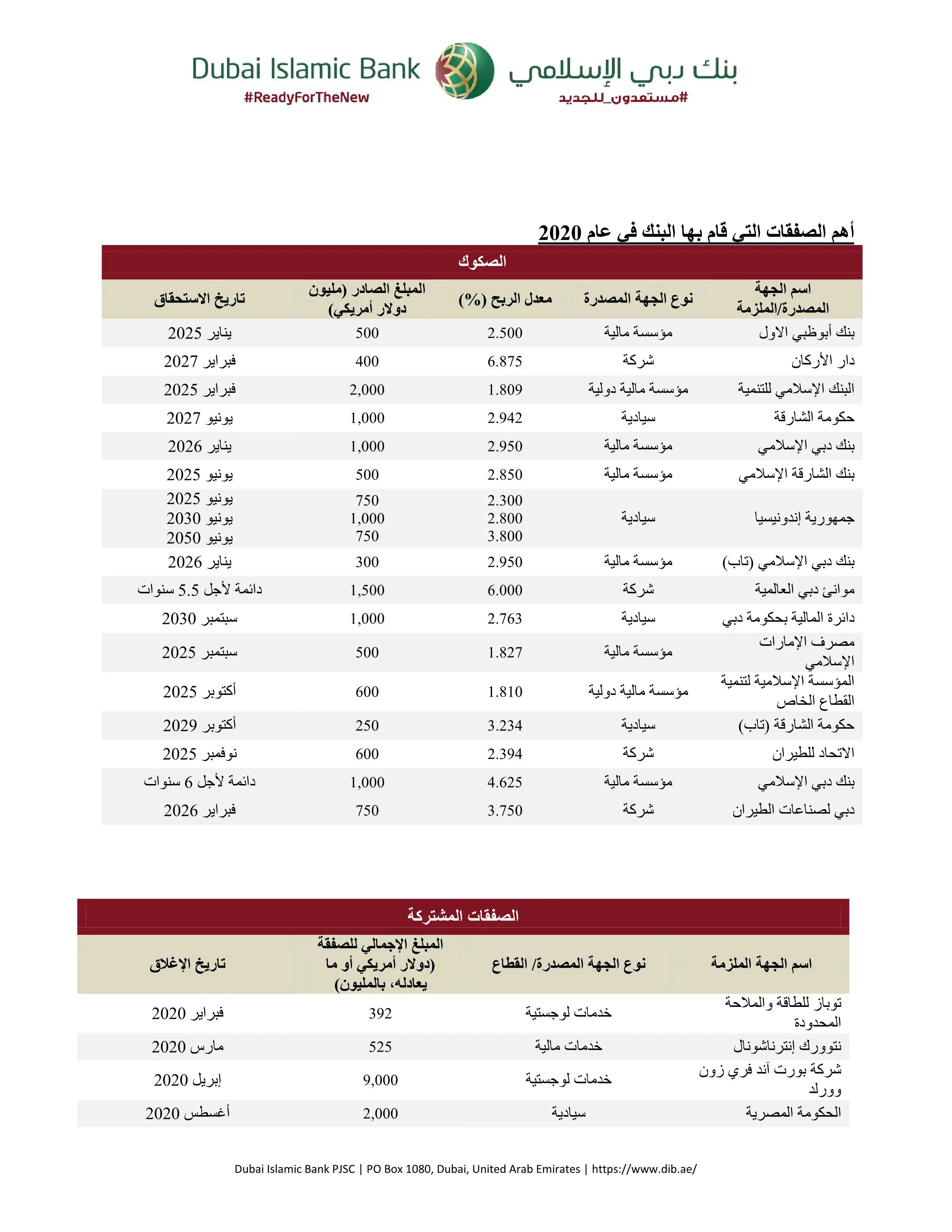 - نجح بنك دبي الإسلامي في نوفمبر 2020، في تسعير إصدار صكوك دائمة قياسية للشق الأول من رأس المال الإضافي بقيمة 1 مليار دولار أمريكي، بمعدل ربح وصل إلى 4.625% سنوياً. ويحمل هذا الإصدار أقل عائد يحققه أي بنك على الإطلاق على مستوى العالم على صكوك دائمة للشق الأول من رأس المال الإضافي، والصكوك الوحيدة من نوعها التي يتم إصدارها في دول مجلس التعاون الخليجي في العام 2020. وبالرغم من الاضطرابات التي شهدتها الأسواق خلال عام 2020 بسبب ذروة تفشي جائحة كوفيد-19، فإن نجاح بنك دبي الإسلامي في هذه الصفقة هو خير دليل على الوضع الائتماني القوي للبنك والمكانة التي يتمتع بها لدى كل من المستثمرين الدوليين والإقليميين. كما تؤكد هذه الصفقة ثقة المستثمرين الدوليين ليس فقط في بنك دبي الإسلامي ولكن في دبي والإمارات العربية المتحدة.