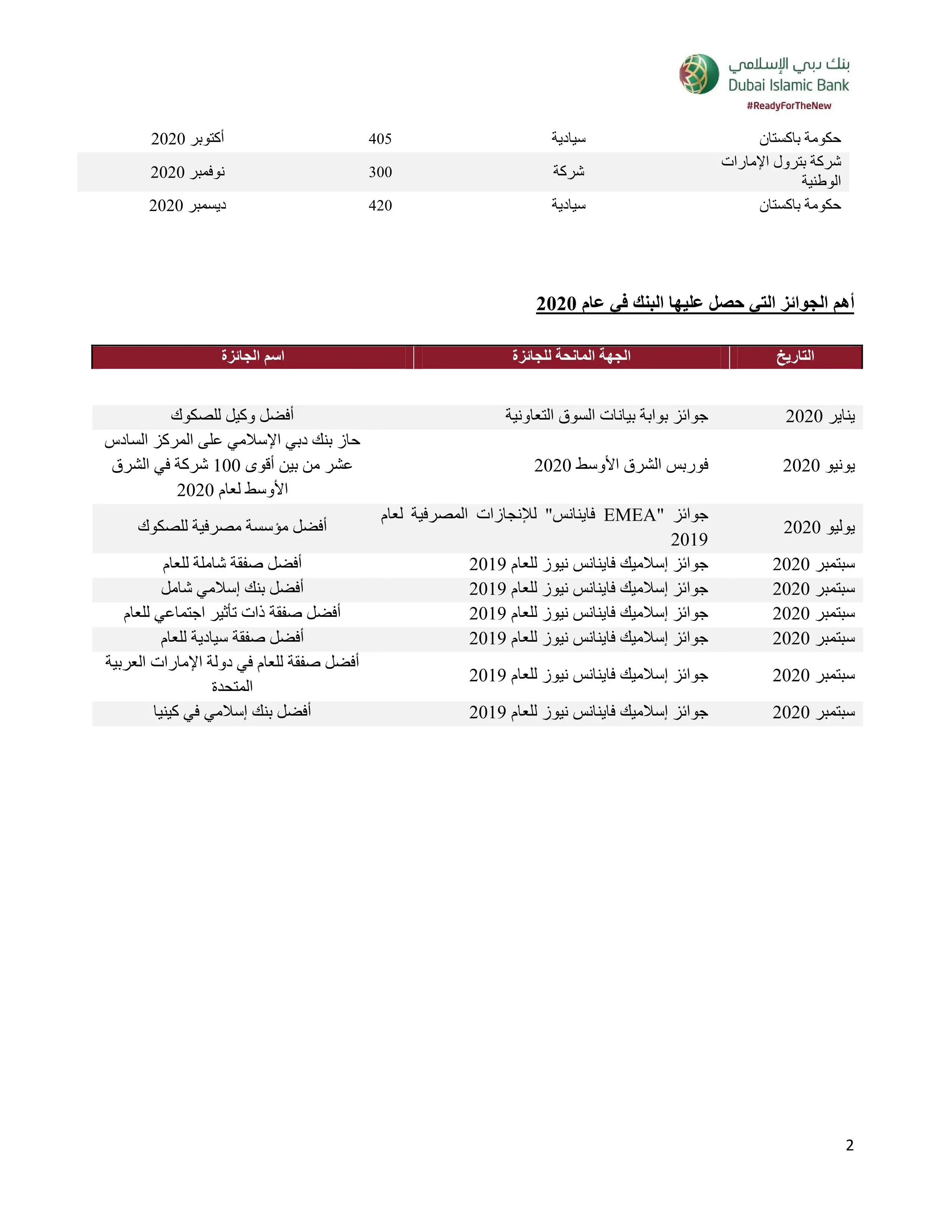 - لا يزال بنك دبي الإسلامي يحتل مركز الصدارة في قطاع التمويل الإسلامي وأسواق رأس المال، على الرغم من التحديات الكبيرة التي شهدها العام 2020، حيث أنجز صفقات تجاوزت قيمتها 27 مليار دولار أمريكي. وواصل بنك دبي الإسلامي إبرام صفقات رفيعة المستوى شملت مجموعة من المتعاملين من مؤسسات سيادية وشبه سيادية ودولية وشركات كبرى ومؤسسات مالية. ولا يزال البنك يتصدر تصنيف بلومبيرج للتمويل الإسلامي في أوروبا والشرق الأوسط وافريقيا (منظم رئيسي) وكذلك (مدير اكتتاب)، وهو أيضاً من بين أعلى جداول تصنيف بلومبرج للتمويل الإسلامي والصكوك في العالم اليوم.