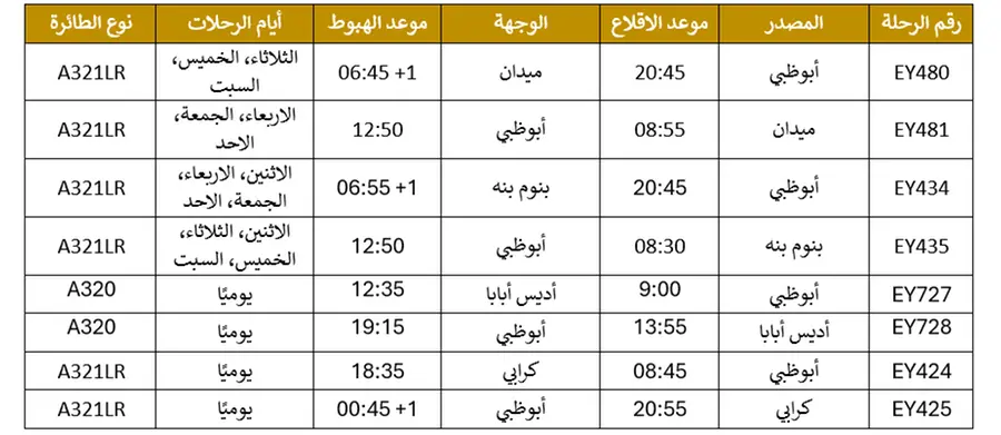 - تُشغّل الاتحاد للطيران الوجهة بواسطة طائرة إيرباص A321LR مع أجنحة الدرجة الأولى وأسِرّة مسطّحة بالكامل ومقاعد الجيل التالي في الدرجة السياحية