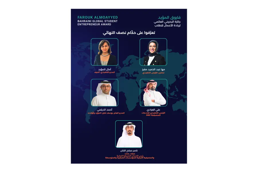 المنامة، مملكة البحرين: أعلنت منظمة رواد الأعمال في مملكة البحرين (EO Bahrain) عن تشكيل لجنة التحكيم الخاصة بجائزة بجائزة "فاروق المؤيد البحرينية العالمية لريادة الأعمال الطلابية"(GSEA Bahrain)، والتي تحمل اسم الراحل فاروق المؤيد، أحد أبرز روّاد الأعمال في مملكة البحرين والمنطقة، تكريمًا لإرثه الريادي وإسهاماته البارزة في دعم وتمكين الشباب وتعزيز ثقافة الابتكار وريادة الأعمال.