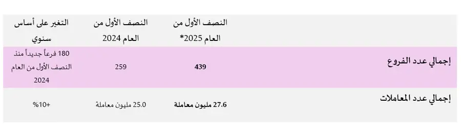 - ارتفع إجمالي عدد المعاملات في النصف الأول من العام 2025 بنسبة 10% مقارنةً بنفس الفترة من العام الماضي، ليصل إلى 28 مليون معاملة.