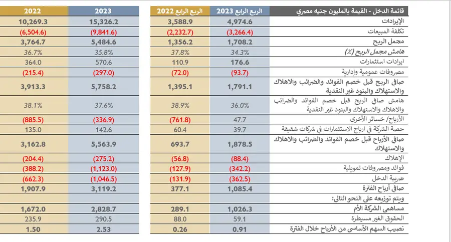 أظهرت نتائج الربع الرابع من 2023 نموًا قويًا بفضل قدرة الشركة على مواجهة التحديات التشغيلية المحيطة. فقد ارتفعت إجمالي الإيرادات بنسبة 38,6٪ لتصل إلى 5,0 مليار جنيه مصري في الربع الرابع من 2023 مقابل 2,9 مليار جنيه مصري في الربع الرابع من 2022. فقد أرتفع مجمل الربح بنسبة 26,0٪ ليصل إلى 1,8 مليار جنيه مصري مصحوب بهامش مجمل ربح قدره 34,3٪. وقد ارتفعت أيضا الأرباح التشغيلية قبل خصم الفوائد والضرائب والاهلاك والاستهلاك والبنود غير النقدية بنسبة 28,4٪ لتصل إلى 1,8 مليار جنيه مصري خلال الربع الرابع من 2023 مصحوبا بهامش 36,0٪. وتماشياً مع هذا الأداء القوي، فقد ارتفع صافي الربح بنسبة 187,8٪ ليصل الي 1,1 مليار جنيه مصري خلال الربع الرابع من 2023.