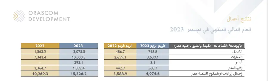 نجحت الشركة في تحقيق مبيعات عقارية حوالي 19,4 مليار جنيه مصري خلال السنة المالية 2023 (عام 2022: 11,1 مليار جنيه مصري)، وهو ما يمثل رقمًا قياسيًا يتجاوز المبيعات العقارية المحققة في العام المالي المنتهي في 2022. وقد جاء أداء الربع الرابع وحده قويًا على الرغم من الظروف الاقتصادية الحالية فقد نجحت الشركة في تحقيق 6,4 مليار جنيه مصري خلال الربع الرابع من عام 2023 بزيادة قدرها 65,9٪ مقابل 3,8 مليار جنيه مصري خلال الربع الرابع من عام 2022. وهي أعلي مبيعات ربع سنوية محققة أيضا في تاريخ الشركة. والجدير بالذكر أن الارتفاع في المبيعات العقارية قد نتج من زيادة أسعار متوسط سعر المتر المربع في جميع الوجهات بالإضافة الي زيادة عدد الوحدات المباعة. احتلت O West المرتبة الأولي في المبيعات العقارية الجديدة للمجموعة خلال 2023 بنسبة (47% من المبيعات)، تليها الجونة بنسبة (39% من المبيعات)، ثم اخيرا مكادي هايتس بنسبة (14% من المبيعات). وتمكنت الشركة من زيادة متوسط سعر المتر المربع في جميع الوجهات.  قامت الشركة بتسليم 1,071 وحدة سكنية خلال 2023 مما انعكس بالإيجاب على أداء القطاع القاري بالمجموعة. فقد واصلت الإيرادات العقارية اتجاهها التصاعدي وارتفعت بنسبة 36,2٪ لتصل إلى 10,0 مليار جنيه مصري في 2023 (عام 2022: 7,3 مليار جنيه مصري). كما ارتفعت الأرباح التشغيلية قبل خصم الفوائد والضرائب والإهلاك والاستهلاك والبنود غير النقدية بنسبة 24,2٪ لتصل إلى 3,9 مليار جنيه مصري في 2023. بينما ارتفعت التحصيلات النقدية العقارية بنسبة 81,2٪ لتصل الي 10,1 مليار جنيه مصري خلال 2023. وارتفعت أيضا الإيرادات المؤجلة من العقارات التي لم يتم الاعتراف بها ضمن القوائم المالية للمجموعة للفترات المالية الممتدة حتى عام 2027 بنسبة 48,2٪ لتصل إلى 22,6 مليار جنيه مصري.