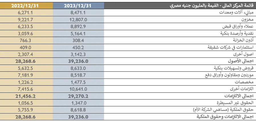 وقد بلغ الرصيد النقدي للشركة حوالي 5,5 مليار جنيه مصري خلال 2023 وهي زيادة 600 مليون جنيه مصري عن التسعة أشهر الأولى من 2023. كما بلغ رصيد القروض من البنوك 7,7 مليار جنيه مصري في 2023. كما بلغ صافي الدين 2,2 مليار جنيه مصري. وترجع الزيادة في القروض بشكل رئيسي إلى انخفاض قيمة الجنيه المصري مقابل العملات الأجنبية. وبلغت صافي الديون إلى صافي الربح قبل خصم الفوائد والضرائب والإهلاك والاستهلاك والبنود غير النقدية 0,4 مرة خلال 2023.