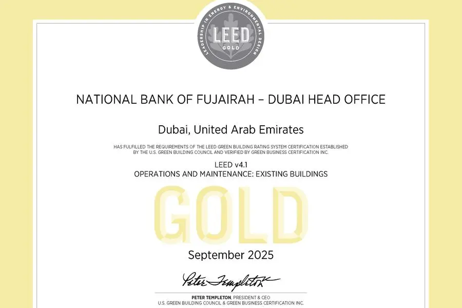 دبي : حصل المقر الرئيسي لبنك الفجيرة الوطني في دبي على الشهادة الذهبية من نظام الريادة في الطاقة والتصميم البيئي (LEED)، وفق معيار LEED v4.1 عن فئة العمليات والصيانة الداخلية القائمة، والذي يُعد المعيار العالمي الرائد في مجال الاستدامة للبيئة المبنية.