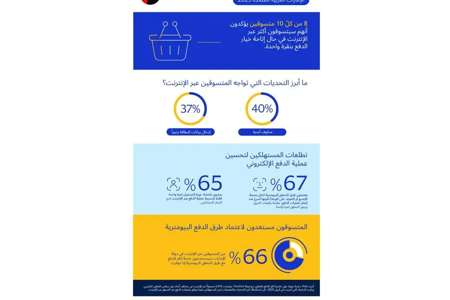 أظهر "تقرير مشكلات عملية الدفع" الصادر عن شركة Visa تفضيلاً كبيراً لتعزيز السلاسة والتبسيط في عمليات الدفع، حيث عبّر 65% من المشاركين عن دعمهم لخيار التسجيل لمرة واحدة لإجراء عمليات الدفع الإلكتروني ضمن جميع المتاجر المشاركة. أما بالنسبة لخيار المصادقة الحيوية، قال ثُلثا المشاركين (67%) إنهم مستعدون لاستخدامها لإجراء عمليات الدفع، فيما أعرب العديد منهم أنهم يثقون في المصادقة الحيوية (بصمة الإصبع وتقنية التعرف على الوجه) أكثر من أساليب الدفع التقليدية (كلمات المرور الدائمة أو الصالحة لمرة واحدة).
