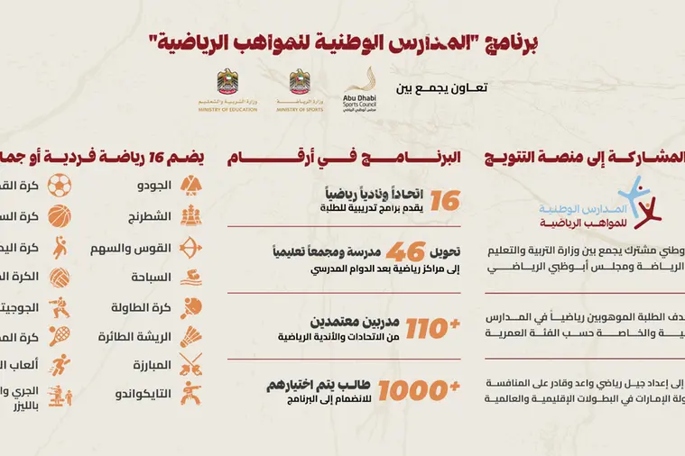 وسيشكل برنامج “المدارس الوطنية للمواهب الرياضية” مساراً تطويرياً ممنهجاً يبدأ من استقطاب واكتشاف المواهب وبناء قدراتهم الرياضية، مروراً بتحديد الطلبة الموهوبين وتطوير أدائهم وتأهيلهم للمنافسات، وصولاً إلى مرحلة النخبة التي تؤهلهم لتمثيل دولة الإمارات في البطولات الإقليمية والدولية.