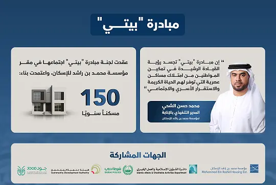 وقال سعادة محمد الشحي، إن مبادرة "بيتي" تجسد رؤية القيادة الرشيدة في تمكين المواطنين من امتلاك مساكن عصرية التي توفر لهم الحياة الكريمة والاستقرار الأسري والاجتماعي، مشيراً إلى أنها تمثل نموذجاً للتكامل بين الجهات الحكومية والخاصة.