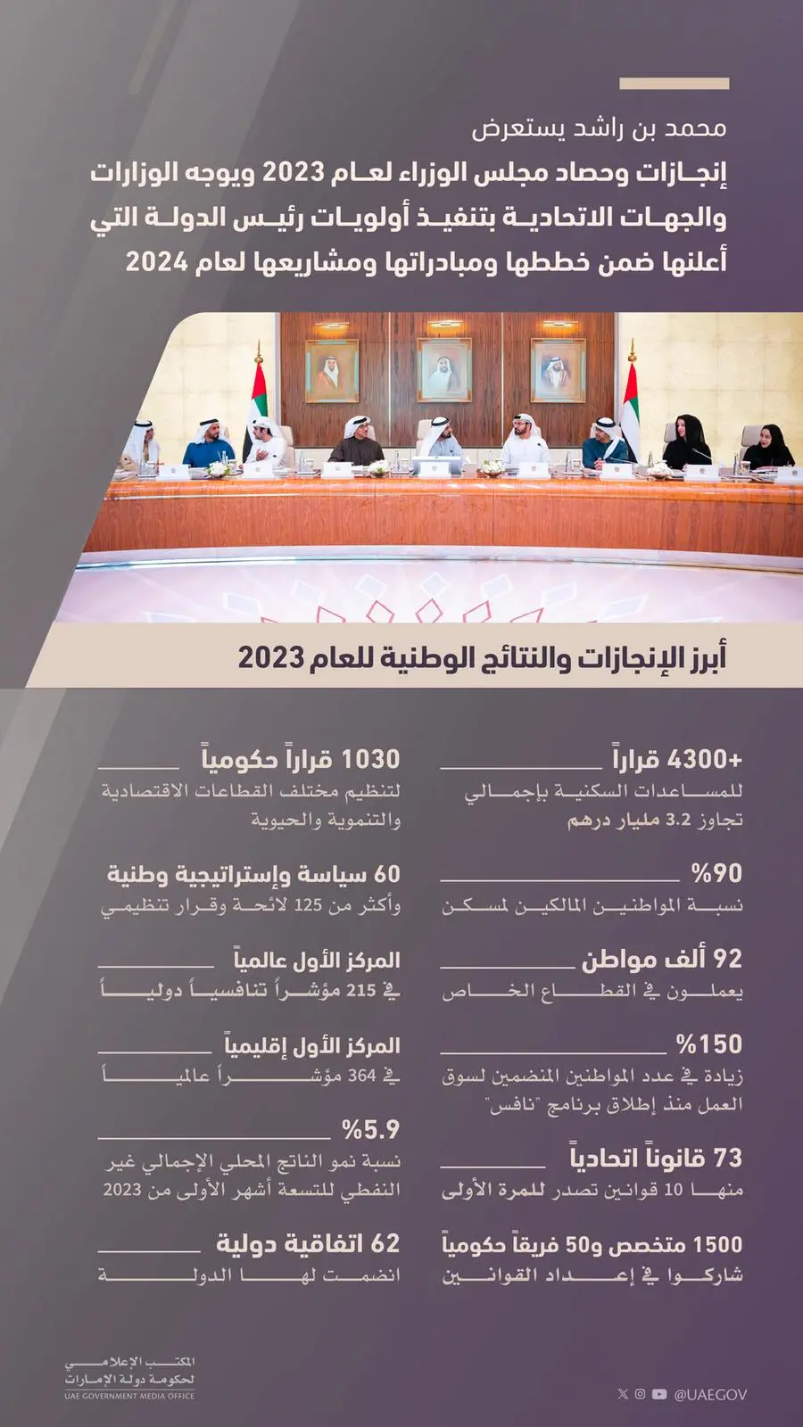 وأضاف صاحب السمو الشيخ محمد بن راشد آل مكتوم: "واعتمد مجلس الوزراء 60 سياسة واستراتيجية وطنية و62 اتفاقية دولية.. وكان العام 2023 هو العام الأنشط تشريعياً في تاريخ الدولة".