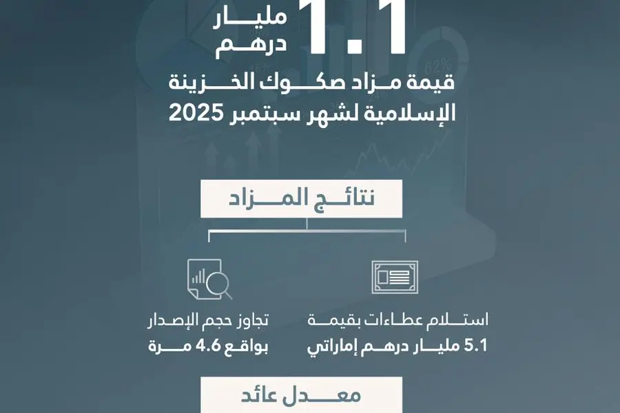 أبو ظبي، الإمارات العربية المتحدة – أعلنت وزارة المالية بصفتها الجهة المُصدرة، وبالتعاون مع مصرف الإمارات العربية المتحدة المركزي بصفته وكيل الإصدار والدفع، عن نجاح مزاد صكوك الخزينة الإسلامية "T-Sukuk" المقوّمة بالدرهم الإماراتي، لشهر سبتمبر بقيمة إجمالية بلغت 1.1 مليار درهم، وذلك ضمن برنامج صكوك الخزينة الإسلامية لعام 2025 كما تم نشره على الموقع الرسمي للوزارة.