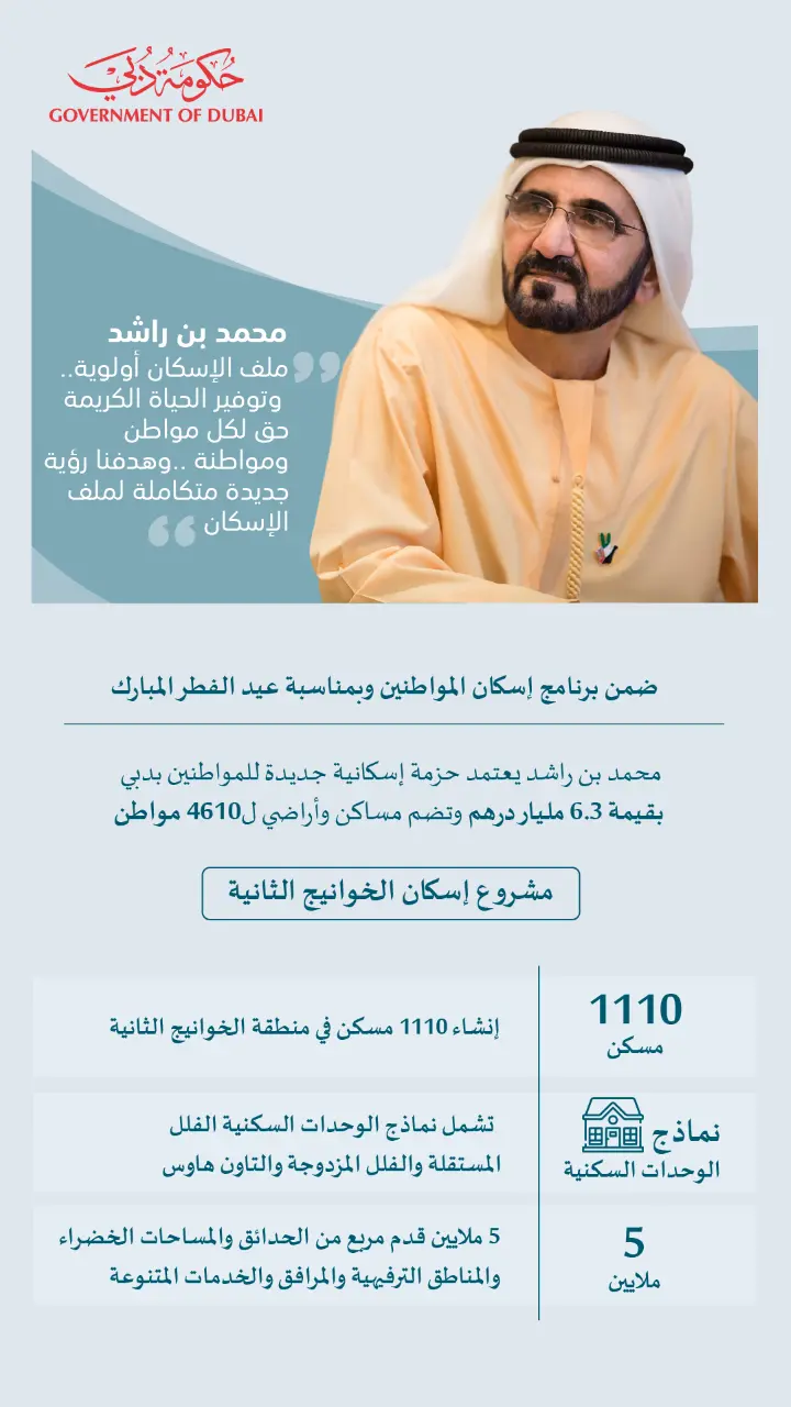 وبهذه المناسبة أكد صاحب السمو الشيخ محمد بن راشد آل مكتوم أن مشاريع الإسكان والخدمات الاجتماعية تأتي في صدارة الأولويات الحكومية لتوفير كافة احتياجات الفرد والأسرة المواطنة، حيث قال سموه "وجهنا اليوم بتخصيص 4610 أرض ومسكن بتكلفة 6.3 مليار درهم ضمن مشروع إسكان المواطنين بدبي . . ملف نتابعه بشكل مباشر لأهميته لنا . . وسنواصل تطويره لمواكبة متطلبات واحتياجات كل أسرة في الإمارة"