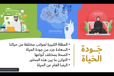 و وتهدف هذه الندوة إلى نشر الوعي عن علم جودة الحياة، وتصحيح بعض المعتقدات الخاطئة عن جودة الحياة. مع توضيح بعض المفاهيم المتعلقة بهذا العلم أو علم النفس الإيجابي، والفرق ما بين السعادة وجودة الحياة وأيهما أكثر شمولاً، حيث استعرضت الأستاذة نوف الجنيبي خلال الندوة علم جودة الحياة، والفرق بينه وبين علم النفس، كما قدمت نموذجاً لجودة الحياة والذي يحوي على عدة محاور مختلفة لرفع مستوى جودة الحياة والعمل على تعزيز السعادة وتسخير الطاقات الشبابية في دعم جودة الحياة.