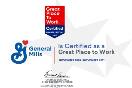 ومن بين 280 شركة مسجلة في قائمة أفضل بيئات العمل لهذا العام، احتلت جنرال ميلز المرتبة الخامسة عشر من أصل 230 شركة حصلت على اعتمادات الهيئة. وتسلط هذه الشهادة المرموقة الضوء على التقدم اللافت الذي أحرزته جنرال ميلز في سعيها لمنح موظفيها بيئة عمل متميزة استناداً إلى عدد من المعايير الأساسية التي تضمنت: (أ) مستويات الثقة بالفريق الإداري، والتي تم تقييمها من خلال آراء الموظفين المتعلقة بالمصداقية والاحترام والسياسات العادلة؛ (ب) شعورهم بالفخر تجاه عملهم؛ (ت) العلاقات المتينة بين الزملاء في بيئة العمل.