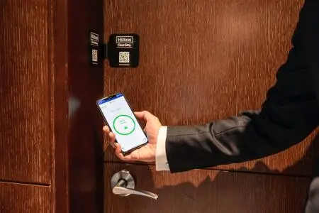 - البهو: يمكن للضيوف الراغبين في تجربة وصول لاتلامسية تماما تسجيل الوصول واختيار غرفتهم وفتح بابهم باستخدام المفتاح الرقمي من على التطبيق الهاتفي الذكي الخاص بهيلتون.وهو خيار متوفر في أكثر من 4700 فندق عبر مختلف علامات هيلتون المشاركة في جميع أنحاء العالم للذين يحجزون مباشرة عبر التطبيق أو موقع Hilton.com. وبالنسبة للضيوف الذين يفضلون تسجيل الوصول التقليدي، سيتم تطبيق إجراءات التباعد الجسدي عند توجيه الضيف خلال عملية تسجيل الوصول والمغادرة بطريقة آمنة.