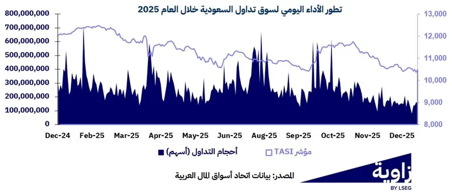 شهدت سوق تداول السعودية عام صعب في 2025، إذ أنهته بتراجع قدره 12.8% في مؤشر تاسي الرئيسي، ليغلق قرب 10,491 نقطة.