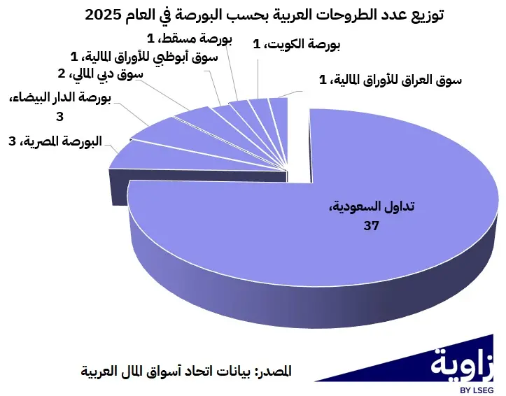 فقد استضافت تداول 37 طرح عام أولي (نحو 76% من إجمالي عدد الطروحات العربية) واستحوذت على 63.9% من إجمالي العائدات، ما يعزز دورها كمحرك رئيسي للإصدارات في المنطقة.