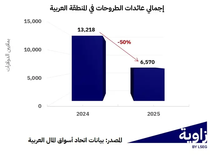 تراجع إجمالي عدد الإدراجات من الطروحات الأولية في المنطقة إلى 49 من 57، بينما انخفضت العائدات الإجمالية إلى النصف لتبلغ 6.6 مليارات دولار مقارنة بحوالي 13.2 مليار دولار في 2024.