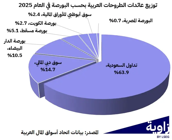 أما خارج السعودية، فقد تلقت العائدات الإجمالية دعم من عدد محدود من البورصات رغم قلة عدد الصفقات: إذ استحوذ سوق دبي المالي على 14.7% من العائدات عبر طرحين فقط، بينما استحوذت بورصة الدار البيضاء على 10.4% عبر ثلاثة طروحات، ما يوحي بمتوسط أحجام صفقات أعلى مقارنة بعدد من الأسواق الأخرى، بينما استحوذت البورصة المصرية على 0.7% من العائدات عبر ثلاثة طروحات.