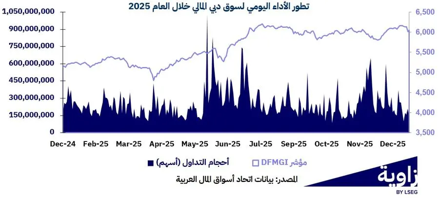 أنهى سوق دبي المالي 2025 كأحد أفضل البورصات أداء في المنطقة العربية، حيث ارتفع المؤشر العام لسوق دبي بنسبة 17.2% خلال العام.