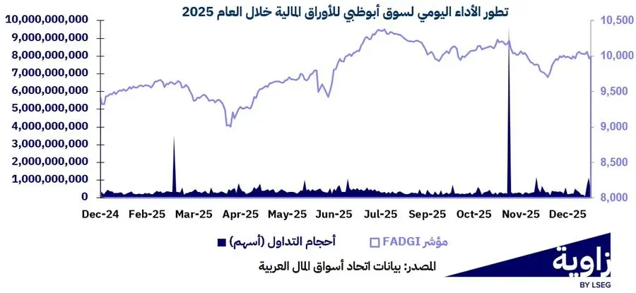 حققت سوق أبوظبي للأوراق المالية أداء إيجابي في 2025، إذ ارتفع مؤشرها الرئيسي بنسبة 6.1% على أساس سنوي، مدعومة بمتانة ديناميكيات النمو غير النفطي واستمرار العمق في الأسهم القيادية ذات القيمة السوقية الكبيرة.