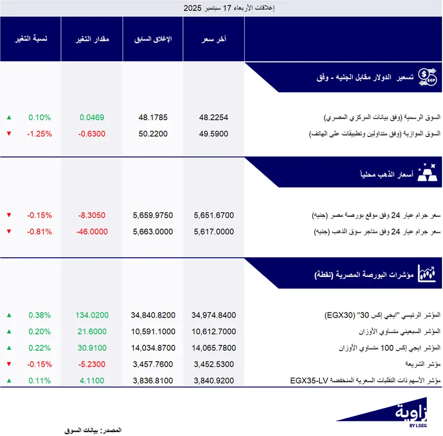 ارتفع مؤشر البورصة الرئيسي EGX30 بنسبة 1.22%، كما صعد مؤشر الشريعة 0.84%، وارتفع مؤشر الأسهم الصغيرى والمتوسطة EGX70 متساوي الأوزان بنسبة 0.06%.