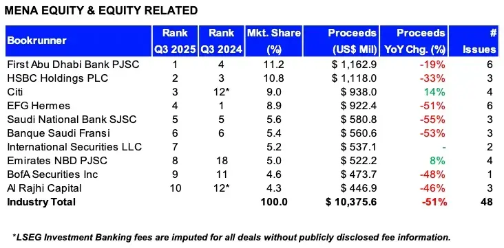 وفق جدول ترتيب أسواق رأس مال الأسهم الموضح أدناه، برز بنك أبوظبي الأول كأفضل مدير اكتتاب بحصة سوقية بلغت 11.2%، تلاه بنك إتش إس بي سي بحصة سوقية بلغت 10.8%.