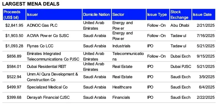 شكلت الاكتتابات العامة الأولية 46% من إجمالي الإصدارات، بينما شكلت الطروحات اللاحقة 54%. وإجمالا تم تسجيل 36 اكتتاب عام أولي - بزيادة ستة اكتتابات عن العام الماضي، وهو أعلى رقم في تسعة أشهر منذ عام 2008 - جمعت 4.8 مليار دولار، بانخفاض طفيف بنسبة 4% عن عام 2024.