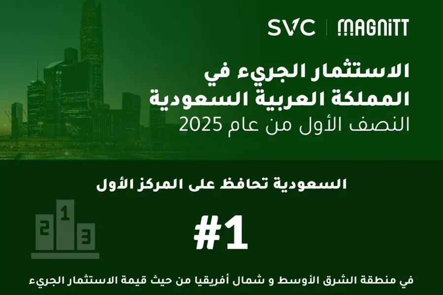 وأكد التقرير الصادر اليوم عن MAGNiTT، منصة بيانات الاستثمار الجريء في الشركات الناشئة، أن المملكة استحوذت على الحصة الأكبر والتي بلغت 56% من إجمالي الاستثمار الجريء في منطقة الشرق الأوسط وشمال إفريقيا في النصف الأول من عام 2025. كما حققت المملكة رقمًا قياسيًا في عدد صفقات الاستثمار الجريء خلال النصف الأول من العام الذي شهد تنفيذ 114 صفقة، ما يؤكد جاذبية السوق السعودية، ويعزز بيئتها التنافسية، ويرسخ قوة اقتصاد المملكة كأكبر اقتصاد في الشرق الأوسط وشمال إفريقيا.