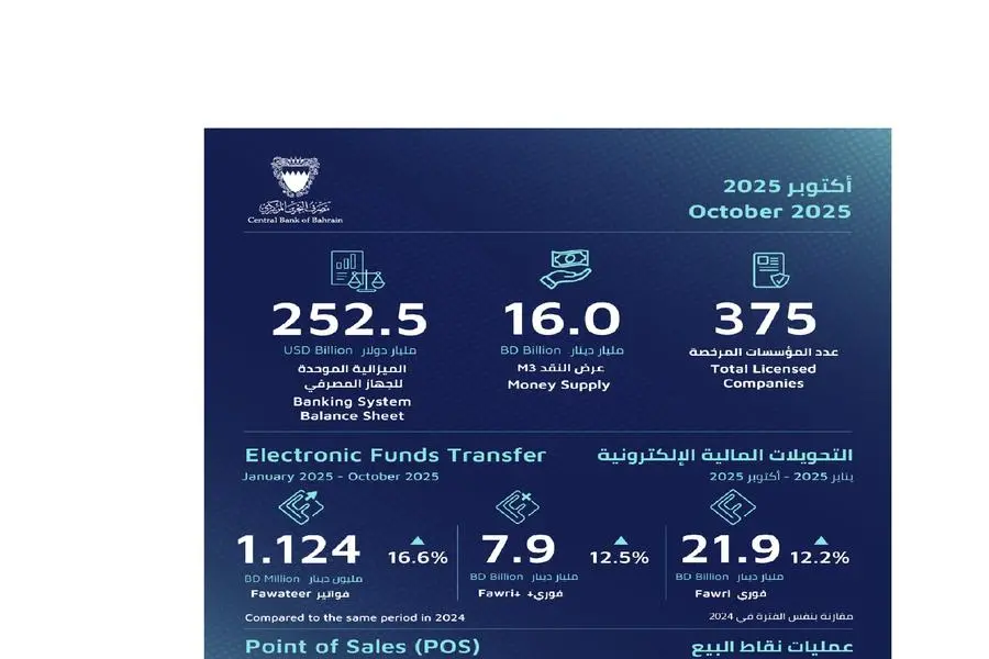 وقد أظهرت بيانات عمليات نقاط البيع للفترة من يناير 2025 إلى أكتوبر من عام 2025 ارتفاعاً في عدد العمليات مقارنة بنفس الفترة من عام 2024 حيث بلغت 217.9 مليون معاملة (77.8% منها باستخدام البطاقات اللاتلامسية)، وبزيادة بنسبة 22.8%. أما بالنسبة للقيمة الإجمالية لهذه العمليات للفترة من يناير 2025 إلى أكتوبر من عام 2025 فقد بلغت 4.3 مليار دينار (51.8% منها باستخدام البطاقات اللاتلامسية)، بارتفاع بنسبة 13.1% مقارنة بنفس الفترة من عام 2024.