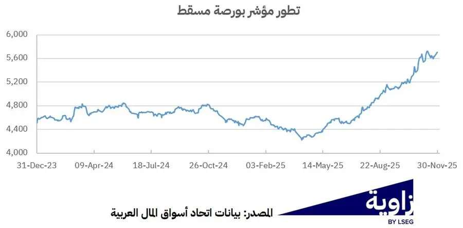 حافظت بورصة مسقط على زخمها الإيجابي في نوفمبر وذلك للشهر الخامس على التوالي، حيث ارتفع المؤشر الرئيسي بنسبة 1.7% خلال الشهر بعد زيادة بلغت 8.3% في أكتوبر، ليغلق عند 5,705.7 نقاط، مسجلاً أعلى مستوى له منذ ثمانية أعوام.