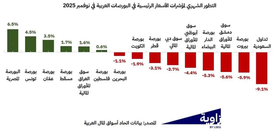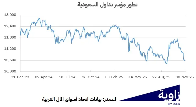 سجلت سوق تداول السعودية، التي تمثل قيمتها السوقية نحو 57% من إجمالي القيمة السوقية الإقليمية، أكبر تراجع شهري بين الأسواق العربية خلال نوفمبر، نتيجة مزيج من تراجع أسعار النفط، تباين نتائج أرباح الشركات، والضغوط العالمية الأوسع على الأسواق.