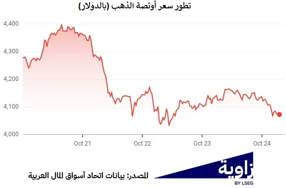 ولكن بقيت أسعار الذهب ضمن نطاق 4,080 و4,150 دولار للأونصة بين 22 و24 أكتوبر وهي الأعلى منذ ما يقارب الأسبوعين.