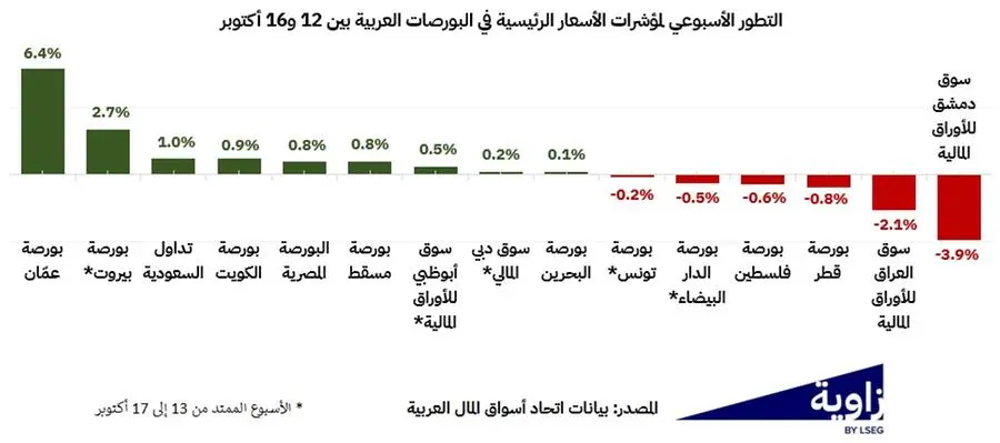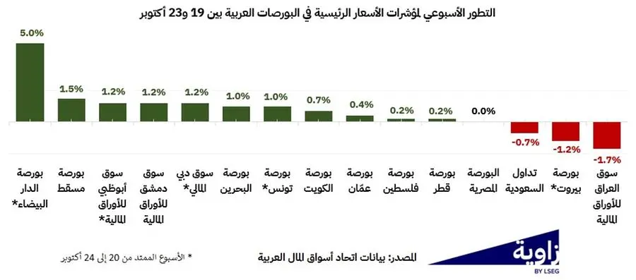 وفي المجمل شهدت أسواق الأسهم العربية أداء ضعيف أو شبه راكد خلال الأسبوع المنتهي في 24 أكتوبر، حيث تحركت غالبية المؤشرات في نطاقات ضيقة دون تسجيل زخم صاعد واضح. وذلك في ظل شح للسيولة مع ضبابية كبيرة حول التطورات التجارية والجيوسياسية.