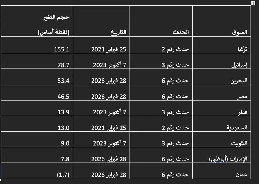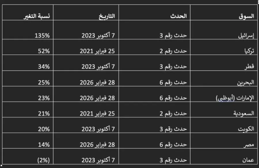 يشمل تحليلنا ستة أحداث نزاعية بين عامي 2020 و2026 سيتم ذكر تفاصيلها لاحقا. ولأغراض تحليلنا، نأخذ في الاعتبار التغير في فروق أسعار عقود مبادلة المخاطر الائتمانية بعد شهر واحد من بدء الأحداث، والتي استمر بعضها أحيانا لبضعة أسابيع.