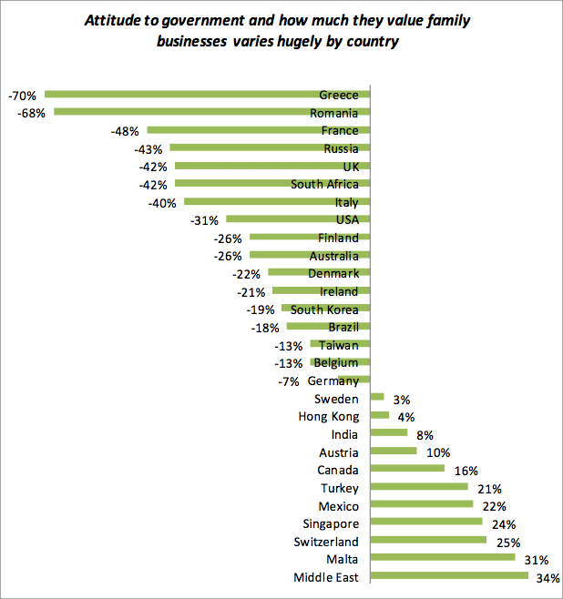 Thirty-four per cent of Middle East family businesses - the highest in the world - believe the government values their business. Family businesses from Malta, Switzerland, Singapore and Mexico are also largely positive towards government attitudes.