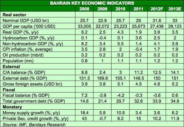 "Bahrain's economic recovery is gradually consolidating but remains exposed to a fragile political landscape. GDP growth fell sharply to 1.9% year-on-year in 2011 from 4.3% year-on-year in 2010, due to social and political unrest as investment (public and private) contracted 27% year-on-year and consumption decelerated sharply," wrote Alia Moubayed, London-based analyst at Barclays Capital.