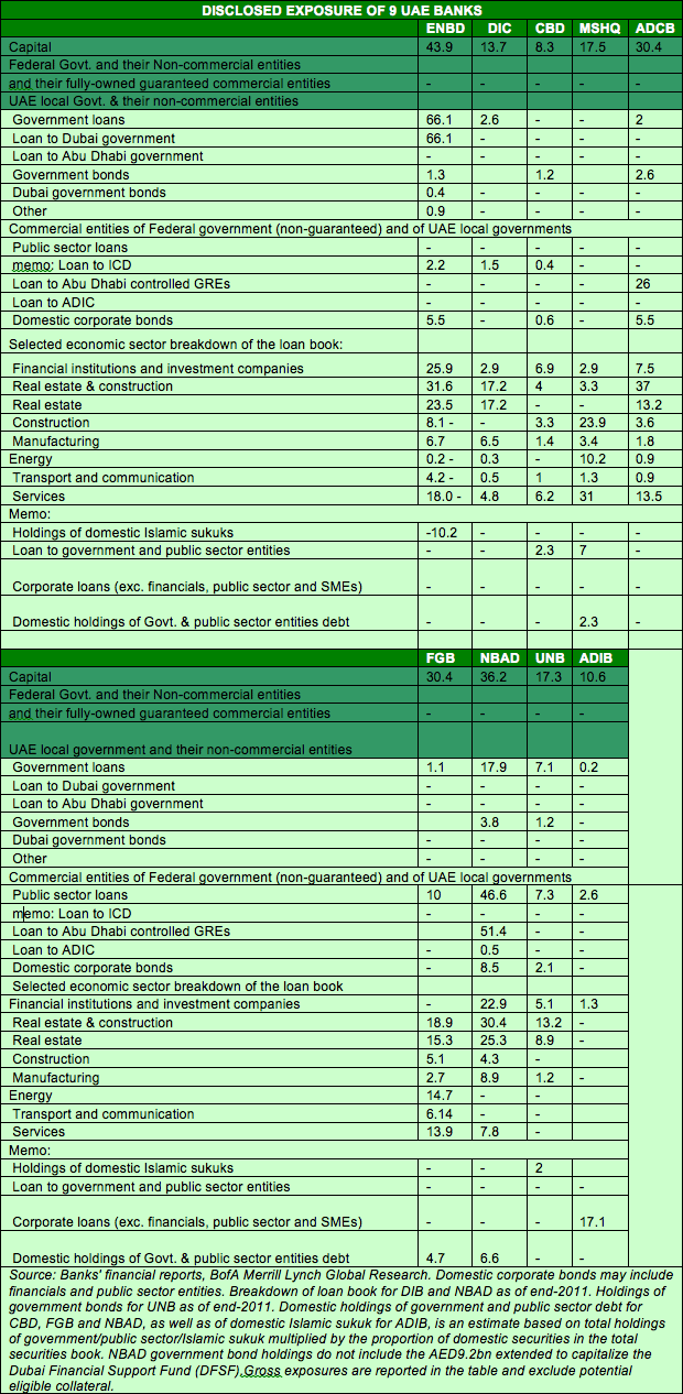 "ADCB's aggregate exposure (loans and bonds) to Abu Dhabi GREs appears close to the 100% threshold. Other banks appear compliant with aggregate exposure limits through we note DIB's large holdings of domestic sukuks and real estate loans could make it breach aggregate exposure limits to GREs."