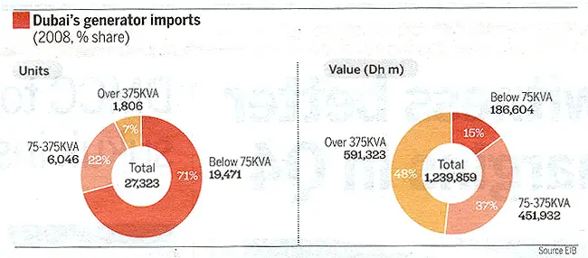 In its monthly economic bulletin, EIB said demand for such generators in the UAE leaped by 40 per cent to Dh1.23 billion in 2008 because of the high growth in power consumption due to an upsurge in construction and other sectors.