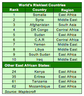 East Africa is already host to 'extreme risk' Somalia (ranked 5th), Sudan (ranked 6th) and South Sudan (ranked 10th), Maplecroft ranking shows.