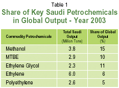 Table ( 1 ) outline the share of key Saudi Commodity petrochemicals in the global production in year 2003.