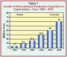 As shown in the Figure, the petrochemical production capacities rose about 6 folds over the last 15 years, from 4.5 million tons/yr in 1985 to 28.8 million tons/yr at the end of 2000. It also shows that this exponential growth pattern is forecasted to maintain its momentum in the next few years reaching around 60 million tons by the year 2010.