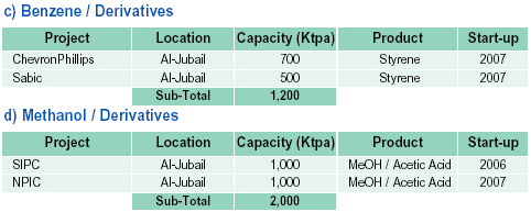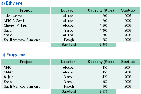 The Saudi petrochemical producers are pushing ahead with plans to add new production capacities, which will total 21.9 million tons over the 2003-2010 time period of which over 13 million tons are basic petrochemicals. The planned basic petrochemicals capacities include :