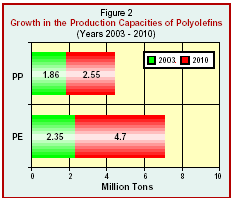 Figure ( 2 ) shows the growth in the production capacities of the polyolefins which will increase from its present level of 4.2 million tons per year to 11.4 million tons per year by 2010. Likewise, this will simulate a similar growth in the domestic consumption of these resins, which will double from its present level of 0.6 million tons per year in 2003 to 1.1 million tons per year by 2010.