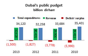 The public budget deficit decreased from Dh1.8 billion in 2012 to Dh1.5 billion in 2013 as a result of higher revenues by about 7.2 per cent from about Dh30.4 billion to Dh32.6 billion, increased government expenditure by about 5.8 per cent from Dh32.3 billion to Dh34.1 billion between 2012-2013. As a percentage of GDP, the budget deficit has dropped from about 0.6 per cent in 2012 to less than 0.05 per cent.